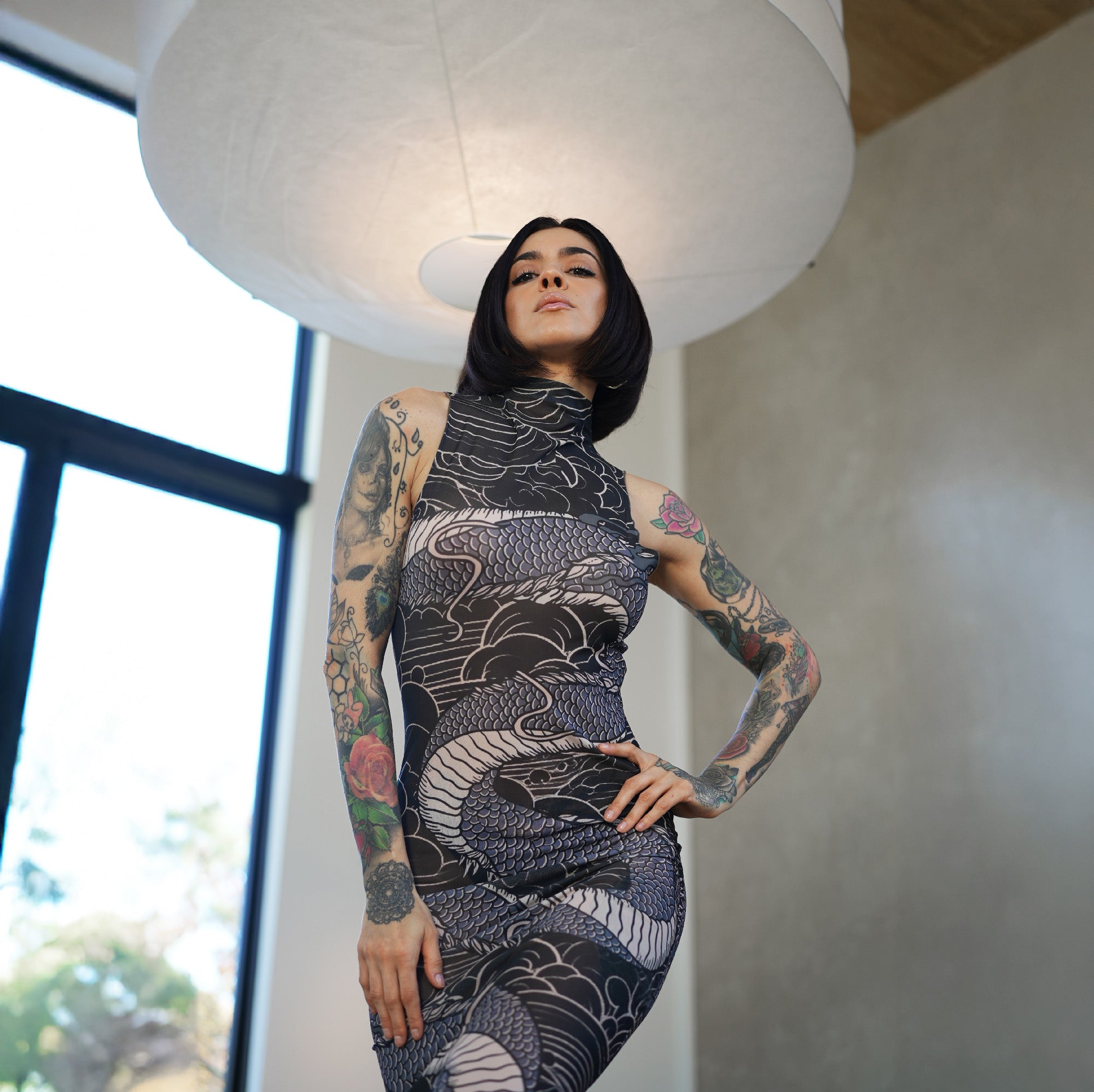 breathtaking Chinese-inspired Dragon Mesh Sheer Dress. Crafted to captivate, this seductive ensemble seamlessly blends elegance with sensuality.