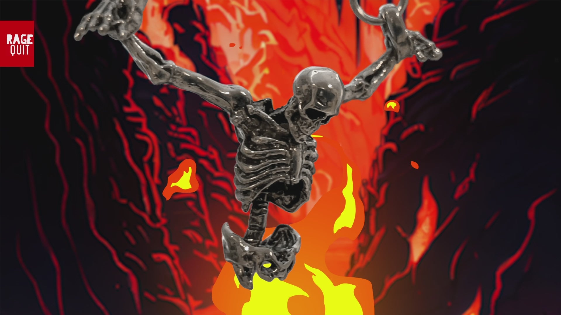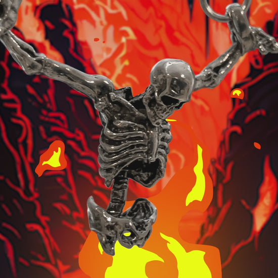 The centerpiece of this dark masterpiece is a stunning metallic pendant, depicting the bony frame of a human skeleton in exquisite detail.