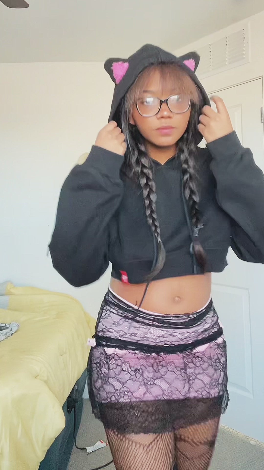 Cat ears black cropped hoodie with open shoulders, lace up, crop top