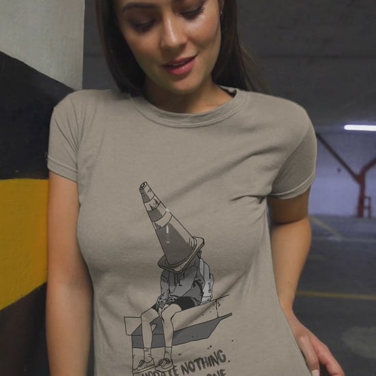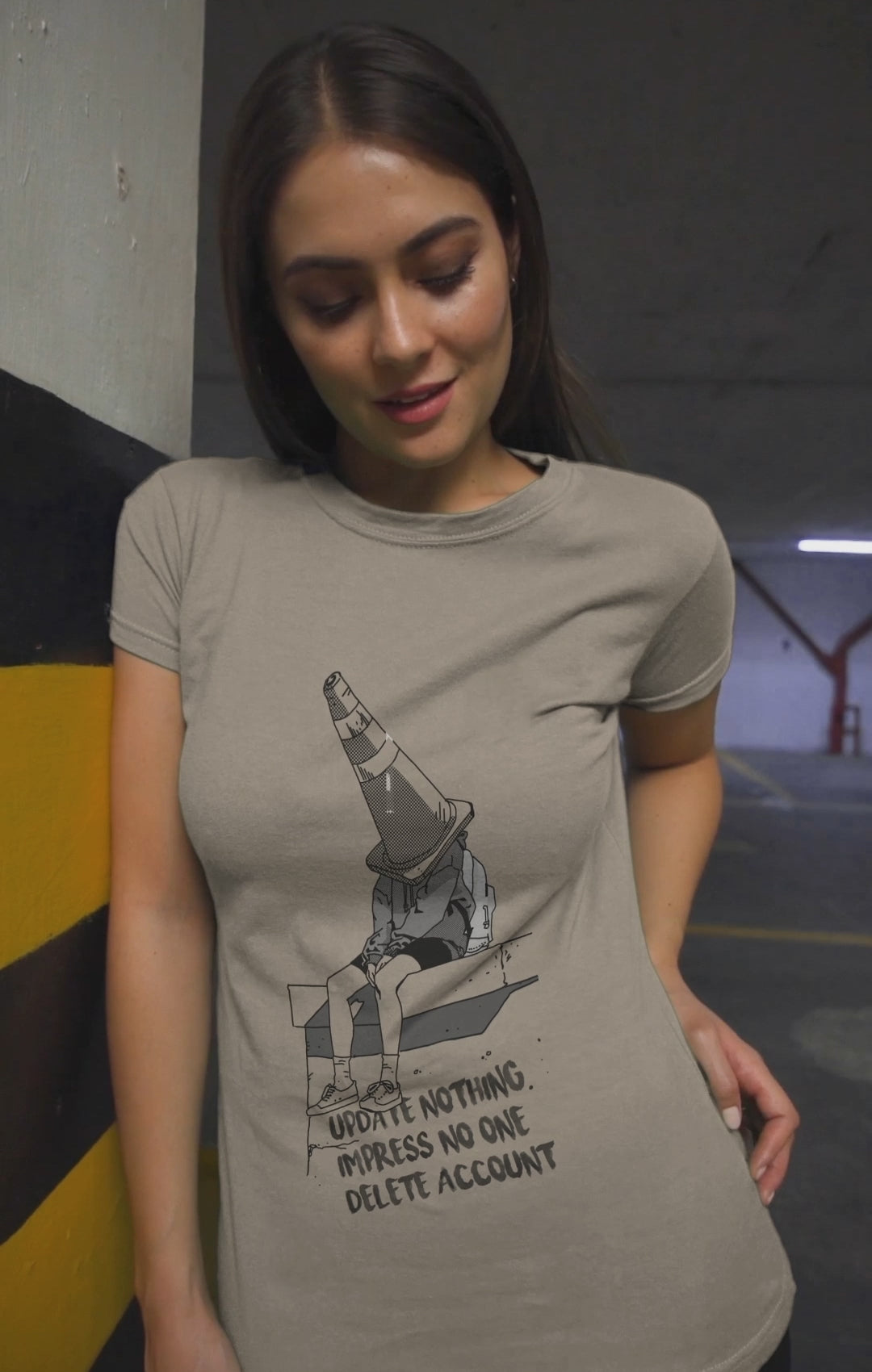 This unique t-shirt features an illustration of a girl fearlessly wearing a traffic cone on her head, sending a powerful message. With the statement, "update nothing, impress no one, delete your account," it gently encourages you to pause and reflect on the profound impact of social media on our lives.