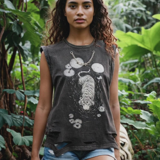 ๐ซ๏ธ Mineral Wash Dark Gray distressed sleeveless shirt with a decorative necklace.