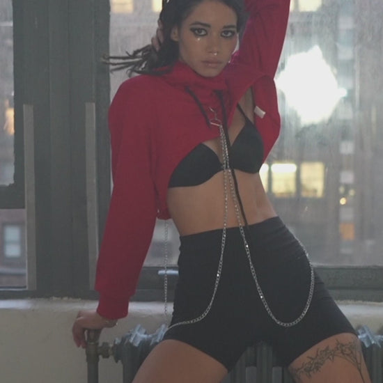This women's long sleeve hooded crop top features a bold bust cutout and edgy decorative chains,