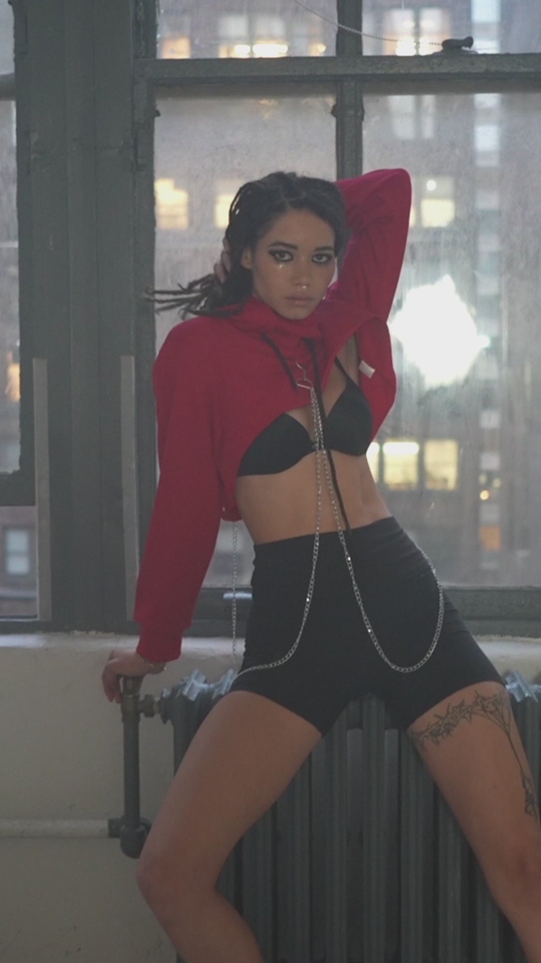 women long sleeves hooded crop top, bust out cut with decorative chains, punk attitude hoodie